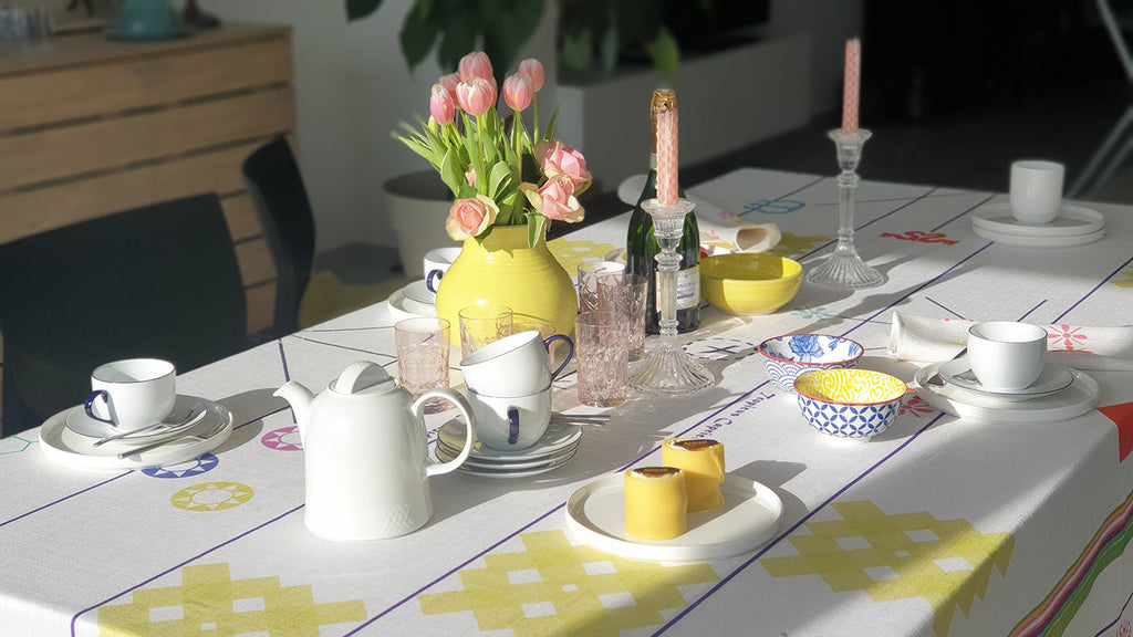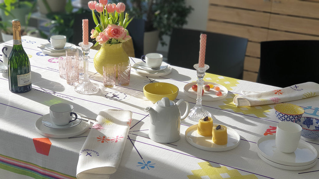 Voldoende witruimte én toch ook kleuraccenten. Slim design: alle aandacht kan naar jouw creatieve invulling gaan, terwijl de zomers tinten, subtiele accenten leggen. De ontwerpen in de reeks Celestial Navigation laten creatieve ruimte om de tafel te dekken met porselein of servies in strak hedendaags, maar ook in een romantische sfeer.