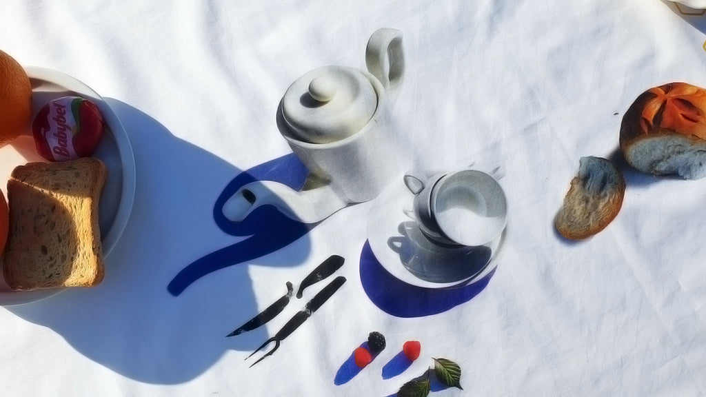Brunch Paradores is een artistiek ontwerp waarbij we een trompe l'oeil – effect uitspelen: het brood, de kopjes: je zou ze zo willen aanraken. Een gedekt tafeltje dat wacht op genodigden. Leg dit tafelkleedje op een zonnig terrasje en ga speels aan de slag met het croissantje en vers geperst appelsiensap.